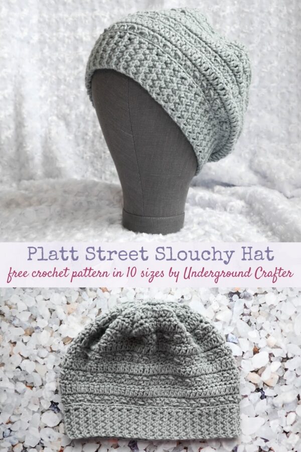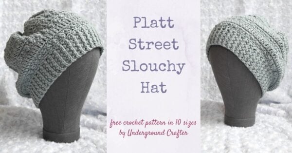 Each day through December 24, 2025, I’m sharing a 2-day free coupon code straight to your inbox for one of my crochet patterns that is perfect for winter or holiday crafting. The Platt Street Slouchy Hat is the December 5 featured pattern. Sign up now to get access to the free PDF! (When you sign up for this list, you get regular updates from Underground Crafter, and an update email about every pattern for the CALs I host as those patterns are released. When you sign up, you’ll also get access to my subscriber vault which includes exclusive free PDF patterns, a coupon code for your choice of any crochet or knitting pattern or ebook from my Ravelry shop, and coupon codes from other indie designers and crafts businesses.)