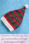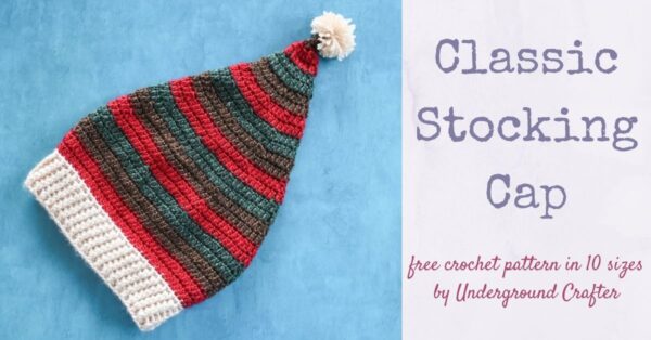 Each day through December 24, 2025, I’m sharing a 2-day free coupon code straight to your inbox for one of my crochet patterns that is perfect for winter or holiday crafting. The Classic Stocking Cap is the December 12 featured pattern. Sign up now to get access to the free PDF! (When you sign up for this list, you get regular updates from Underground Crafter, and an update email about every pattern for the CALs I host as those patterns are released. When you sign up, you’ll also get access to my subscriber vault which includes exclusive free PDF patterns, a coupon code for your choice of any crochet or knitting pattern or ebook from my Ravelry shop, and coupon codes from other indie designers and crafts businesses.)