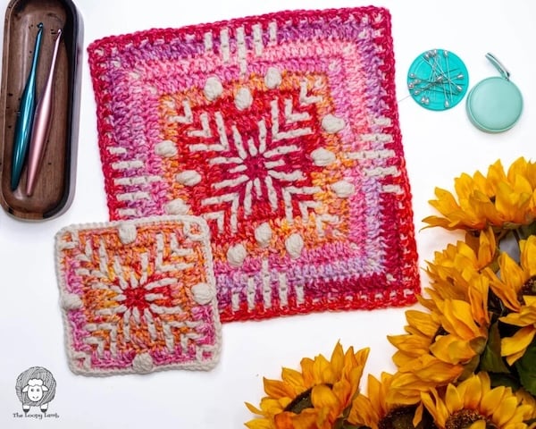 - February 23: Pattern 8 is the Pink Lemonade Mosaic Granny Squares by The Loopy Lamb
