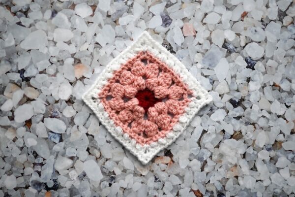- Round 3: (WS) Ch 1, bob in same ch-3 sp, *ch 2, skip next st, bob in next ch-1 sp, ch 2, skip next st,** (bob, ch 3, bob) in corner ch-3 sp; rep from * around, ending last rep at **, bob in first ch-3 sp, ch 1, join with hdc (counts as last 2 ch in ch-3 sp) to first bob. – 5 sts (3 bob + 2 ch-2 sp) on each side + 4 ch-3 sp