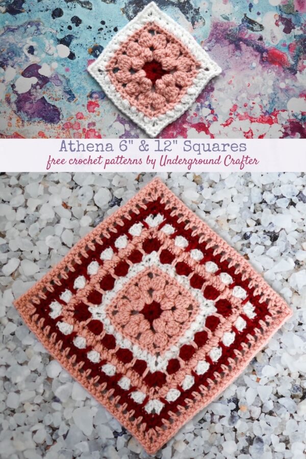 Long-time readers know that crocheting motifs is one of my favorite relaxation activities, and I love to create unique granny squares. The Athena Squares are fun to crochet because the look is pretty different for the 6″ and 12″ variation.