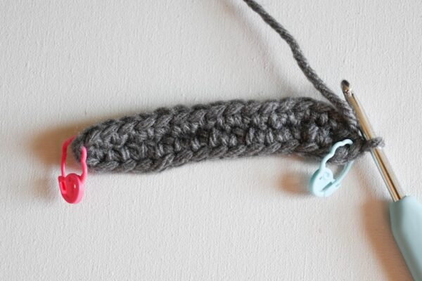 - Rnd 1: Turn, skip 1 ch, sc in next 8 ch, 3 sc in next ch, pm1 in second (middle) of 3 sts to mark increase st, turn to work on underside of foundation chain, sc in next 7 sts, 2 sc in first st, pm2 in last st worked to mark end of Rnd. (20 sts)