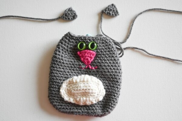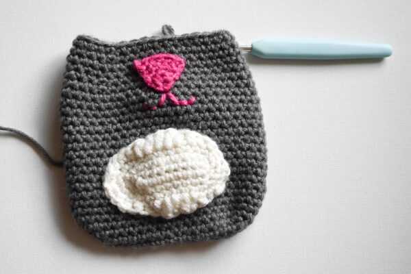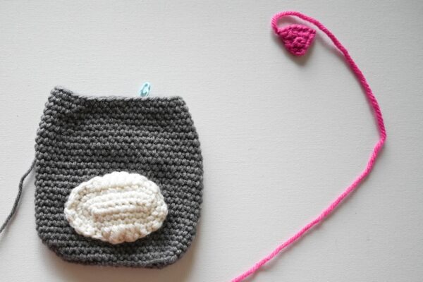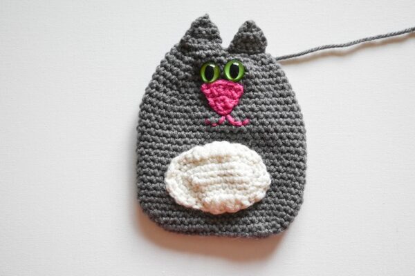 - Thread yarn needle with long yarn tail in CC from Nose. Being careful not to work through both layers of Body, join Nose to Body so it is centered and top is approximately 3 rounds below current round using whipstitch seam. Add Mouth using embroidery back stitch (see Pattern Notes). With yarn needle, weave in ends on inside of Body.