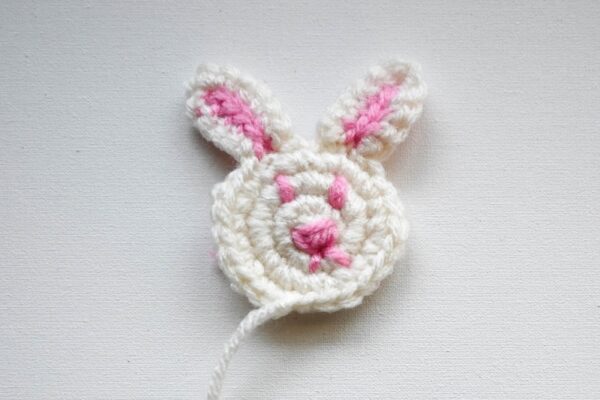 - Row 2: Turn, ch 1, skip current and next sl st on Front, sc in first 4 sts on First Ear, 3 sc in skipped ch at top of First Ear, turn along next side of First Ear, sc in next 4 sts, slstFL to same st on Front, slstFL in next st on Front. Fasten off CA.