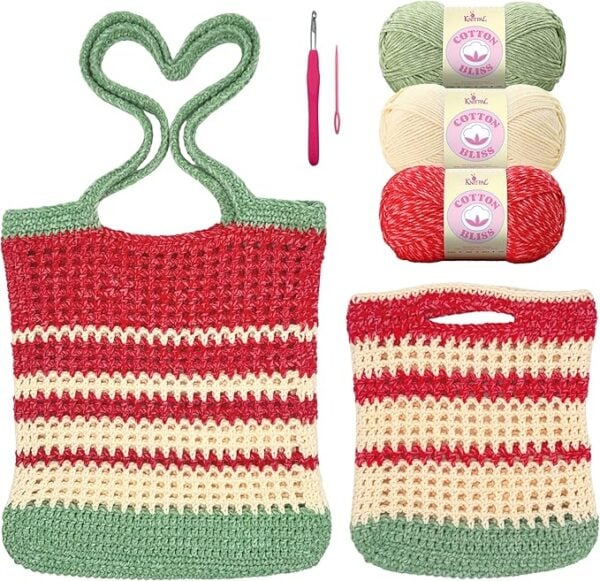 KnitPal is providing one lucky winner with a Sunset Striped Market Bag and Lunch Tote Kit. This fabulous kit is for confident beginners and includes Cotton Bliss yarn (1 skein each of Eucalyptus Green, Soft Buttercream, and Peppered Red), an ergonomic crochet hook, tapestry needle, and two patterns (for a market bag and a lunch tote), plus essential video guidance. Everything you need for your next crochet bag project! Show your support by following KnitPal on Facebook and Instagram.