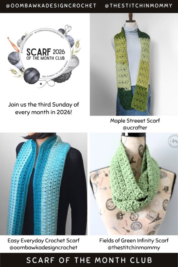 The annual Scarf of the Month Club with Oombawka Design Crochet and The Stitchin’ Mommy is one of my favorite online events, and I’m so excited to be part of it again! You can get the details here on Oombawka Design Crochet and here on The Stitchin’ Mommy. Rhondda and Amy include guest designers, so each month you get 3 free scarf patterns. If you like to make scarves to wear, donate, gift, or sell, this is the Crochet Along for you!