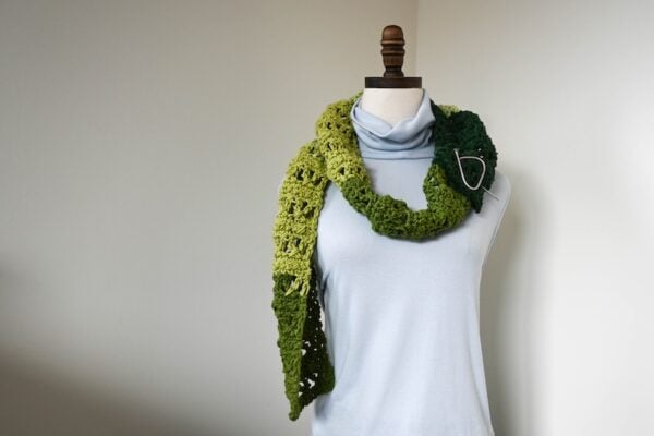 This lacy scarf pattern is ideal for transitional weather or air conditioned rooms in hot weather. Using a very large hook enhances the drape and texture. This pattern was designed for the annual Scarf of the Month Crochet Along with Oombawka Design Crochet and The Stitchin’ Mommy.