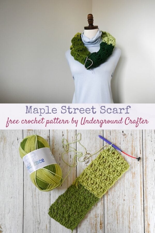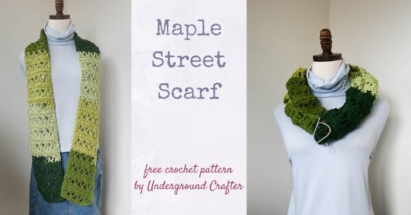 If you make your own Maple Street Scarf, I’d love to see it! Share your progress and questions by tagging me on Facebook as @Underground Crafter on on Instagram as @ucrafter. You can also share a picture in the Underground Crafters Facebook group. Sign up for my weekly newsletter and get a coupon code for your choice of one of my premium patterns and private access to my vault of subscriber goodies. Plus, you’ll never miss one of my free patterns again!